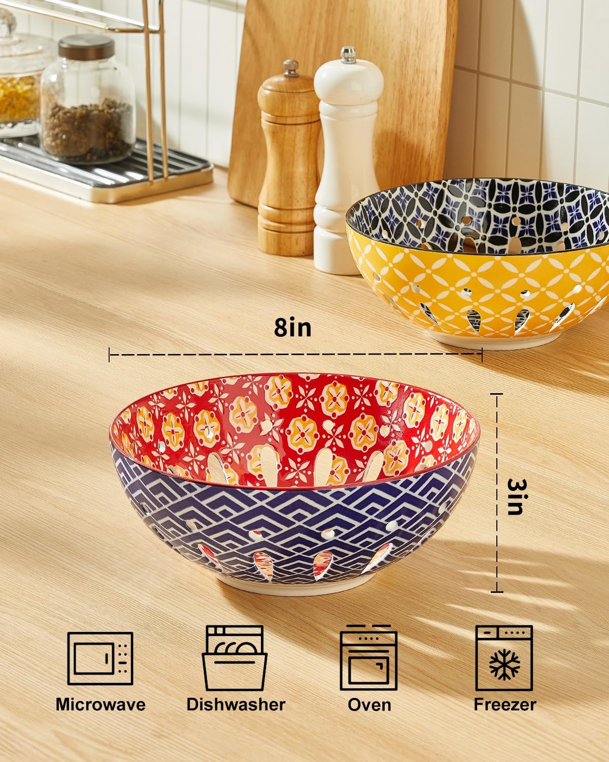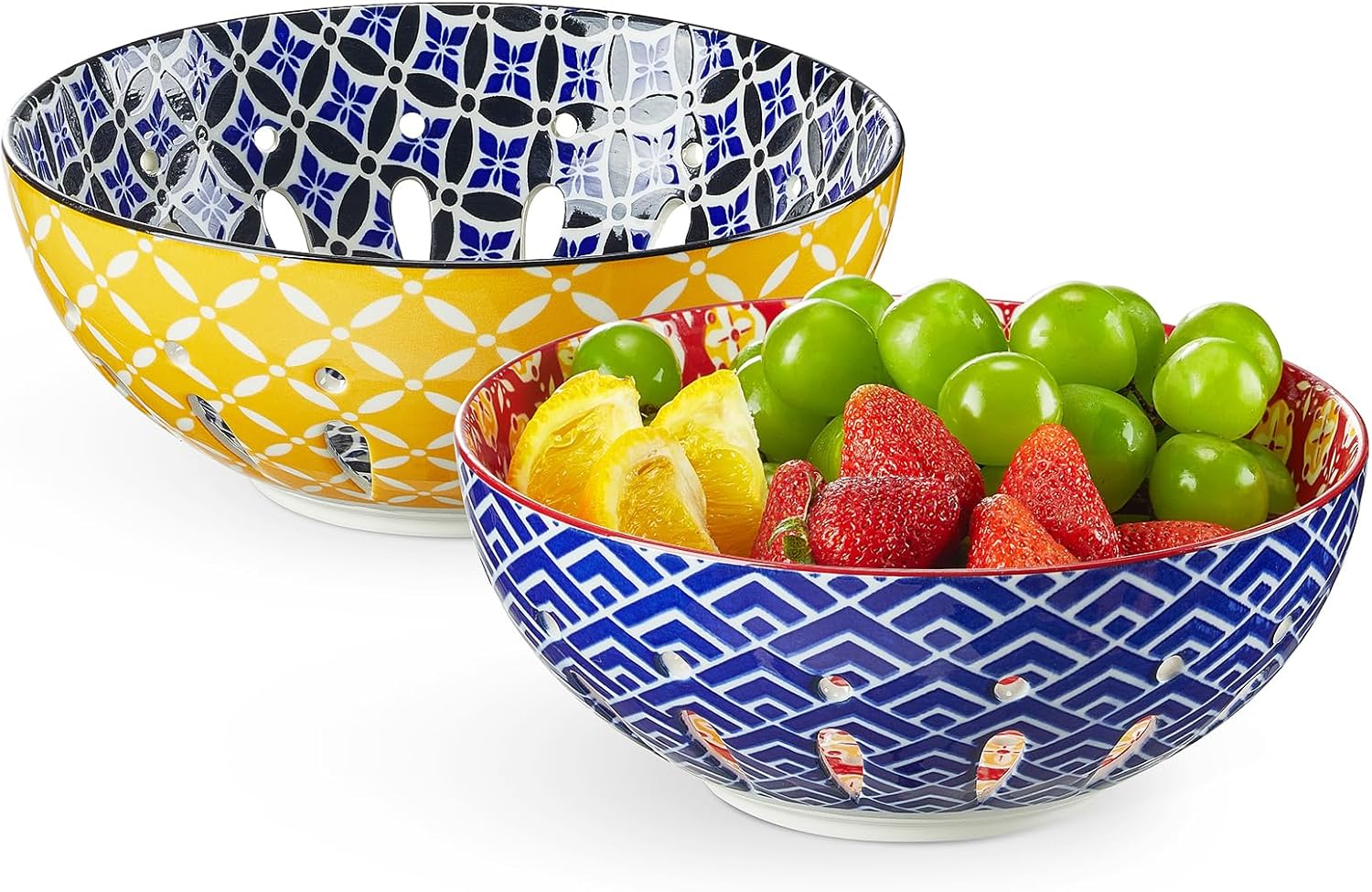 • ??Practical & Stackable??Set of 2 berry bowl measures 8 inches wide and 3 inches high. Spacious enough to hold a large portion of fruits or vegetables. Stackable desgin does not take up much space. Colorful fruit colander is dishwasher, microwave, and freezer safe.